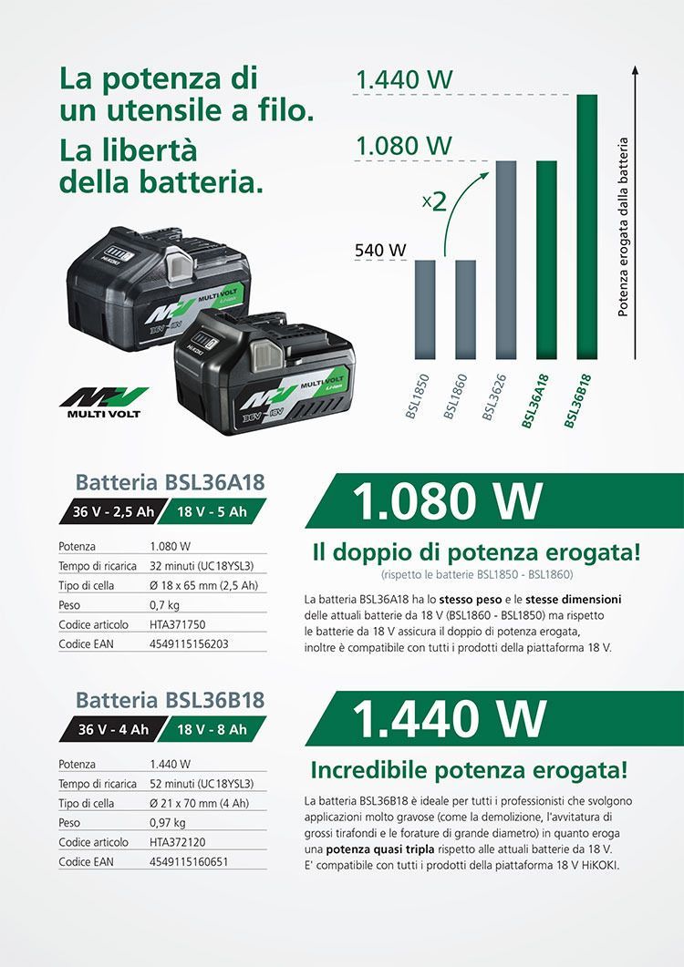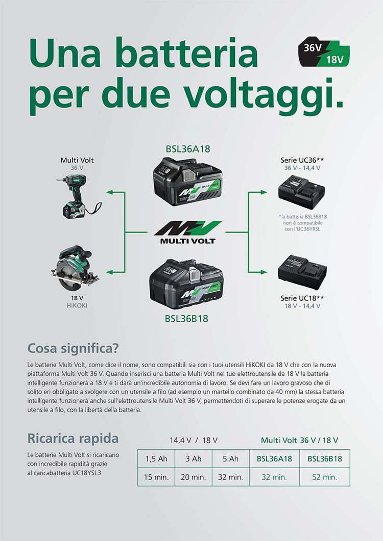 HiKOKI ha migliorato le sue batterie al litio per rendere possibile lavorare con utensili pesanti che in precedenza richiedevano una fonte di alimentazione a filo. Abbiamo introdotto una piattaforma da 36V con batterie a doppia tensione che si adattano automaticamente all'utensile HiKOKI per garantire la massima compatibilità. La potenza erogata non cambia in base alla tensione, ma con gli utensili Multi Volt, la corrente assorbita viene dimezzata, riducendo il calore disperso e aumentando le prestazioni, l'autonomia e la durata dell'elettroutensile. Ogni batteria ha un display a 4 livelli per mostrare la carica residua.